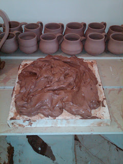 Fresh bag of stoneware clay from my local purveyor. I ran holes into the block of clay maybe two weeks ago and poured water into them and over the clay then resealed it. Now after a little wedging it is softer and easier to work with than what comes right out of the bag. I'm looking for natural local clay to experiment with. More on that after the ground thaws.